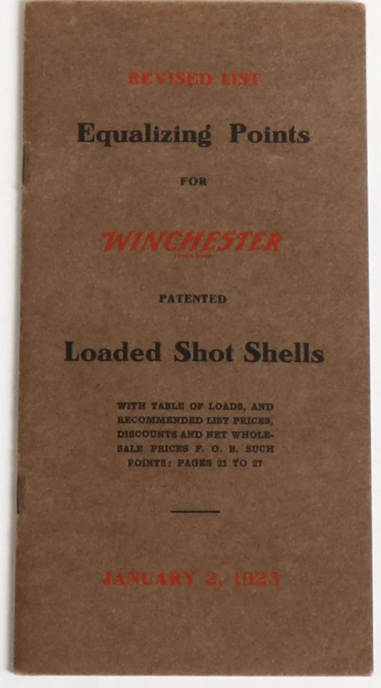 1923 Winchester Equalizing Points for Winchester Loaded Shot Shells pocket catalog, pictures window shot shells, 30 pages, 3 1/8'' x 6''. Grade: Excellent - Value: 2 to 50