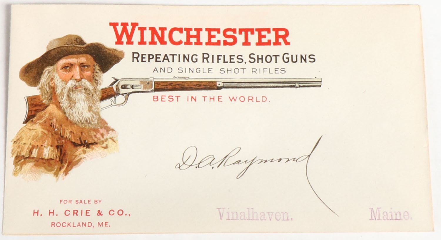 Early Winchester Repeating Rifles, Shot Guns Envelope, Circa 1800's, fantastic full color image of old Chin Whisker & a model 73. Grade: Excellent ++ - Value: 70 to 250