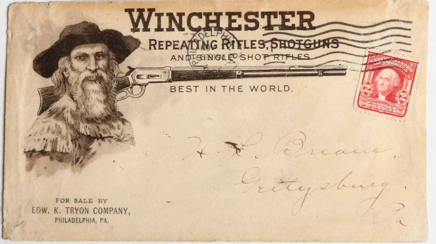 Winchester Repeating Rifles, Shot Guns Envelope, dated 1895, sepia tone image of old Chin Whisker & a model 73. Grade: Very Good - Value: 20 to 100