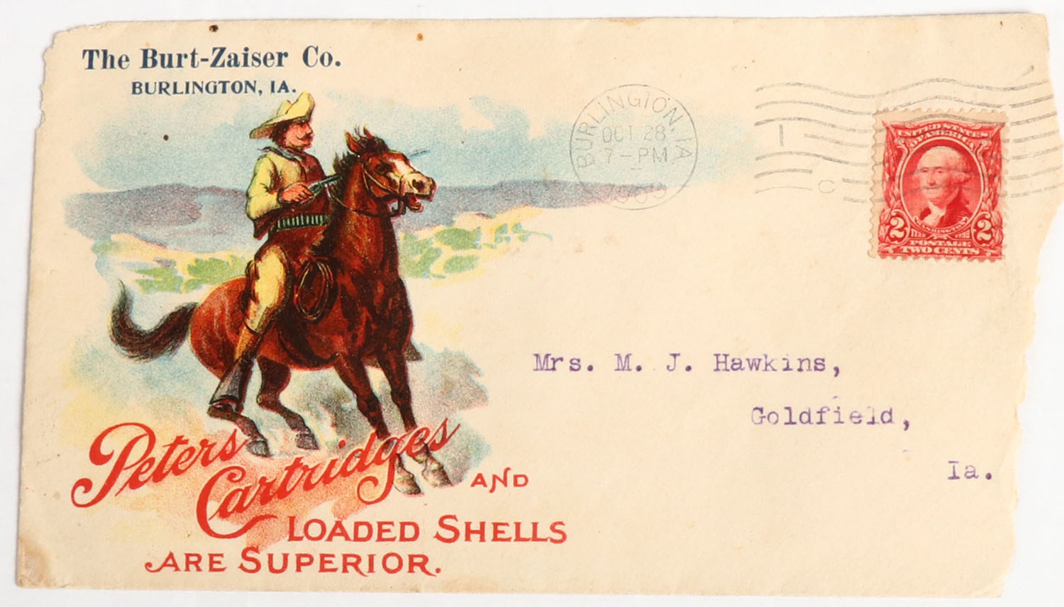 RARE Peters Cart. Co. Envelope, dated 1903, pictures full color image of hunter on horseback, very colorful. Grade: Very Good ++ - Value: 40 to 200