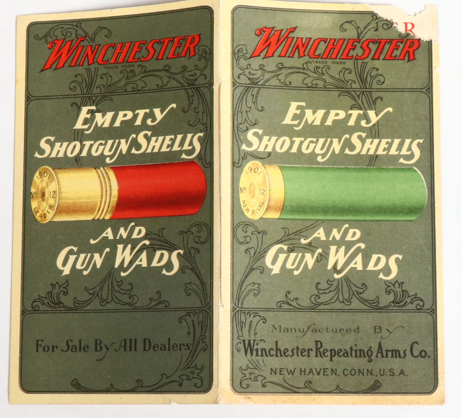 RARE Winchester Empty Shotgun Shells & Gun Wads booklet, inside pages ha wonderful full color images of shotshells, 8 pages, 3 1/2'' x 6''. Grade: Very Good ++ - Value: 40 to 250