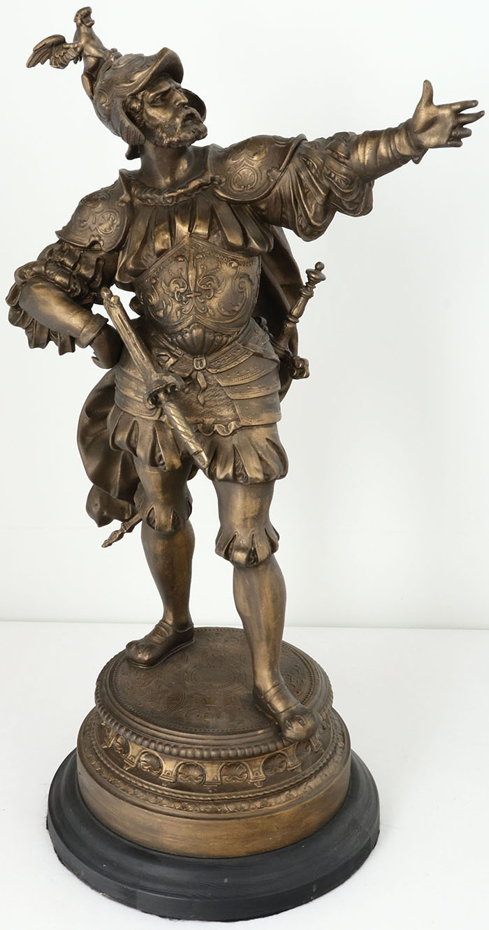 Medieval sculpture of warrior, hollow metal no name, 24'' x 7'' 7''. Grade: Excellent - Value: 10 to 500