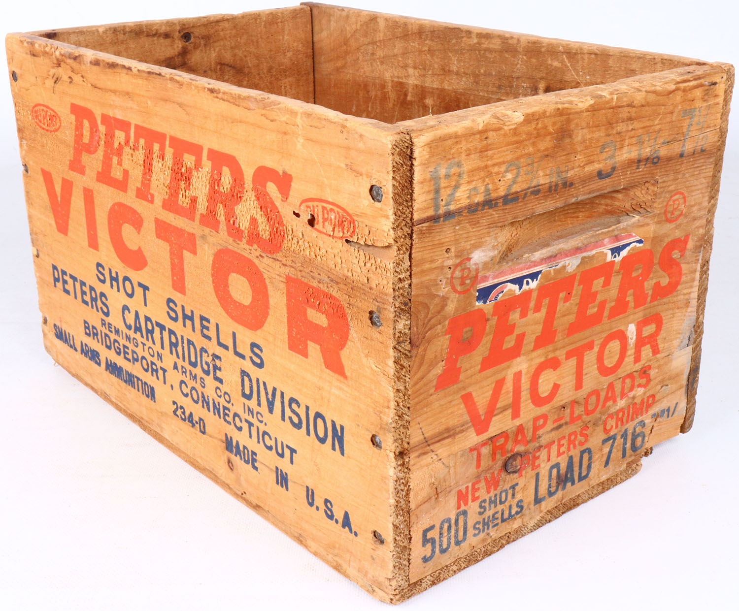 Peters Victor 12 ga., 3 - 1 1/8 - 7 1/2, nail construction, orange & blue print is solid, crate has minor age soiling, one end & bottom have small piece missing, appears to have remains of original paper label, overall solid. Grade: Very Good + - Value: 20 to 80