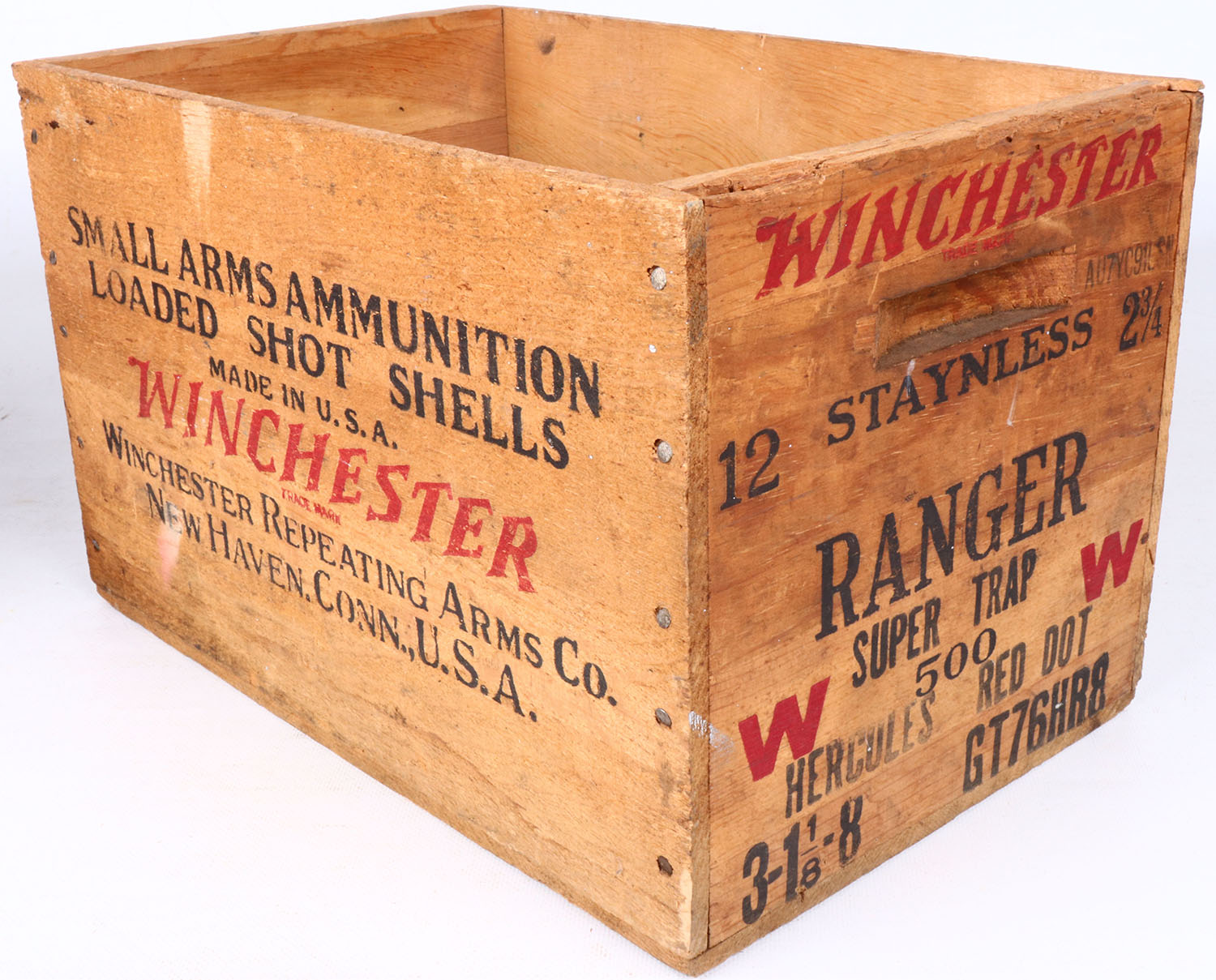 Winchester Ranger, 12 Ga. 3 - 1 1/8 - 8, nail construction wood shipping crate, black & Red print is solid, crate has minor dings & is overall solid, has ''Marshall-Wells Co'' label on one end. Grade: Excellent - Value: 20 to 100