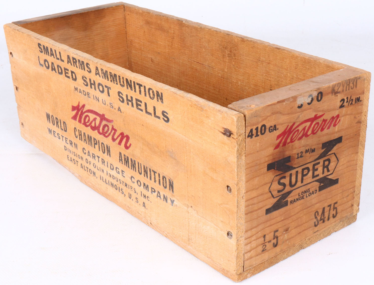 Western Super-X, 410 Ga., nail construction wood shipping crate, black & red print is solid, minimal soiling, bottom is missing chunk, overall solid. Grade: Excellent - Value: 20 to 100