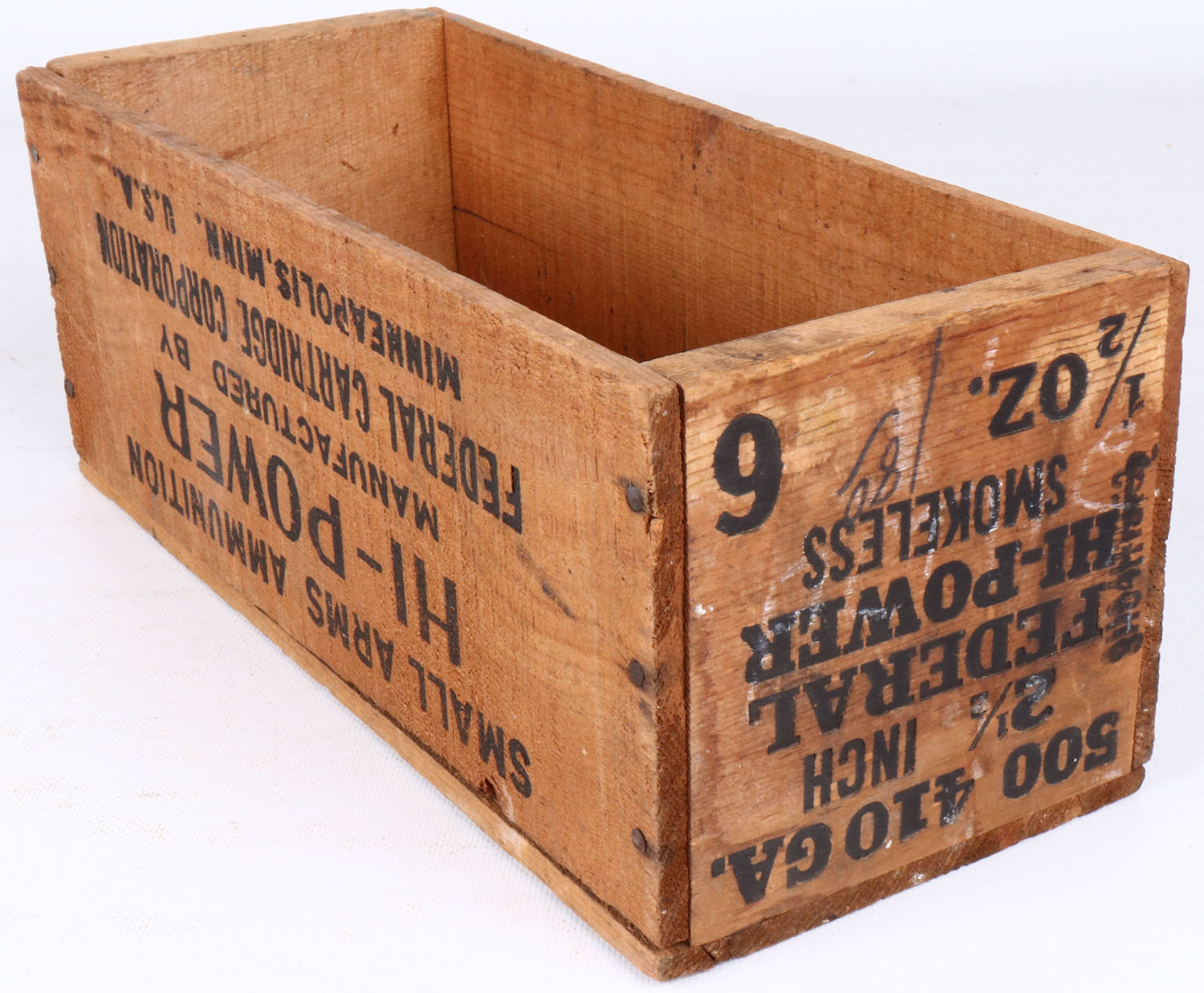 Federal Cart. Hi-Power wood shipping crate, .410 ga. 2 12 in, 1/2 oz., 6 shot , nail construction, black print is fading on top, missing bottom, has pen markings on top and one end. Grade: Very Good - Value: 10 to 60