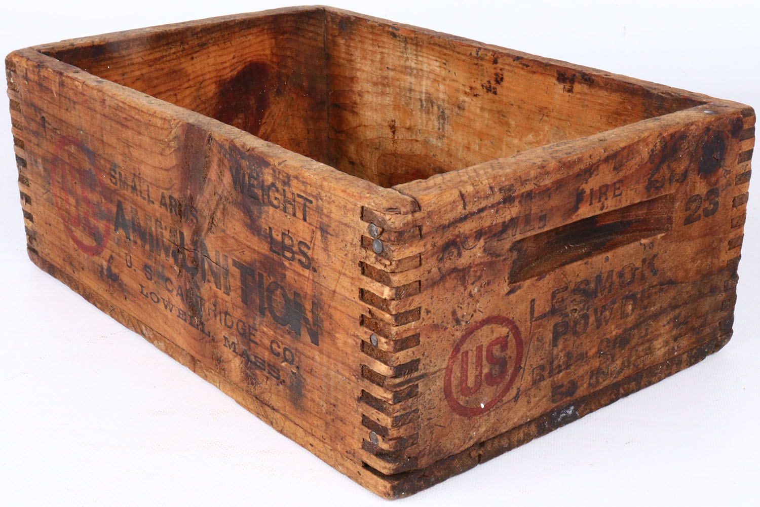 US 22 Short Lesmok, tongue and groove construction wood shipping crate, red & black print is faded, crate is solid but has age soiling. Grade: Very Good + - Value: 6 to 40