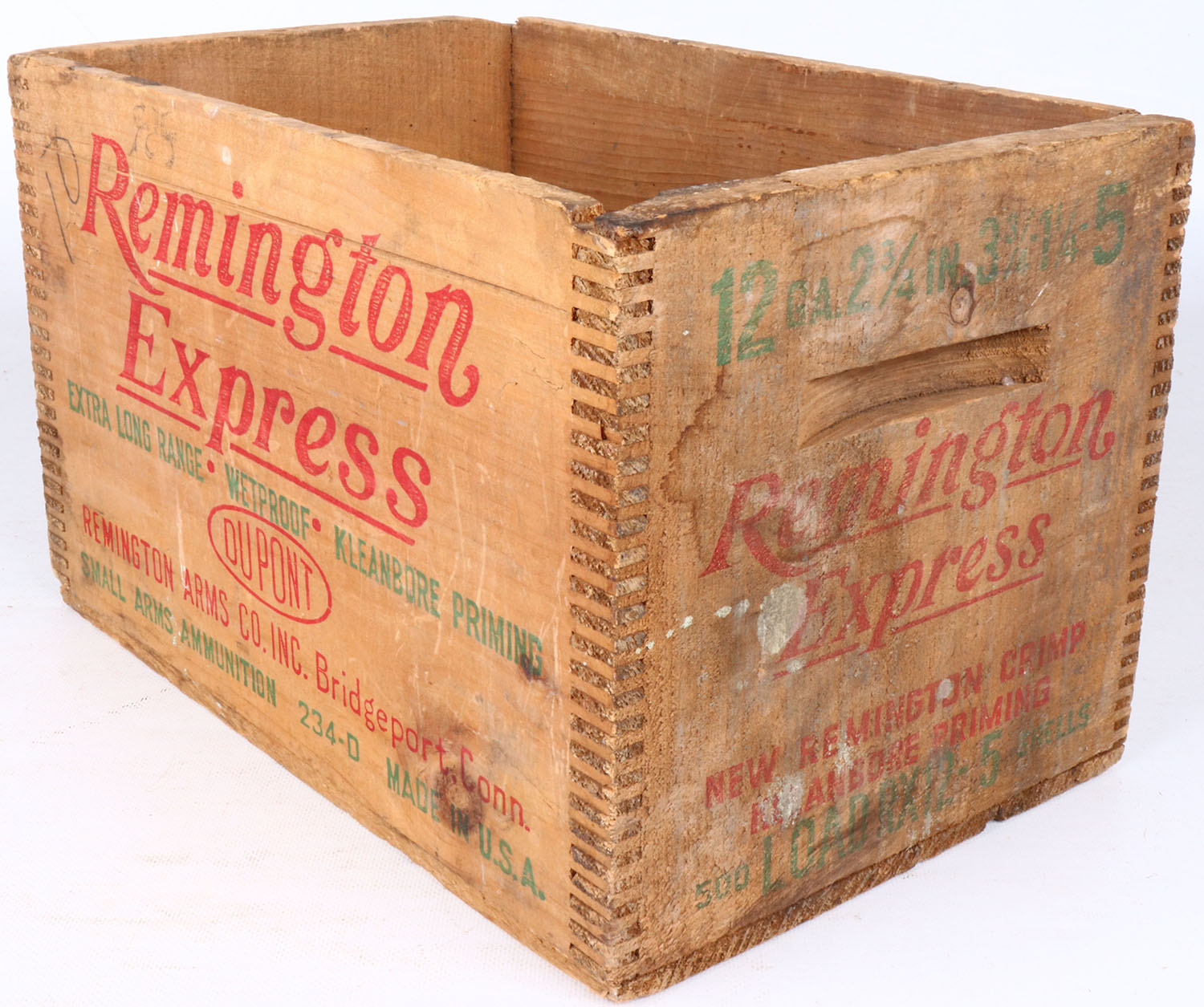 Remington Express, 12 Ga., 5 shot, tongue & groove construction, red, & green print is solid on sides but fading on ends, crate is solid & has paper label on one end. Grade: Very Good ++ - Value: 10 to 50