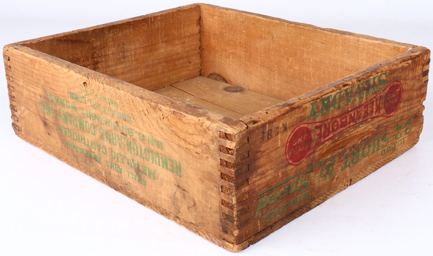 Remington 22 Short Hi-Speed, tongue & groove construction, red & green print is fading, crate has some age soiling & wear, missing bottom. Grade: Very Good - Value: 10 to 40