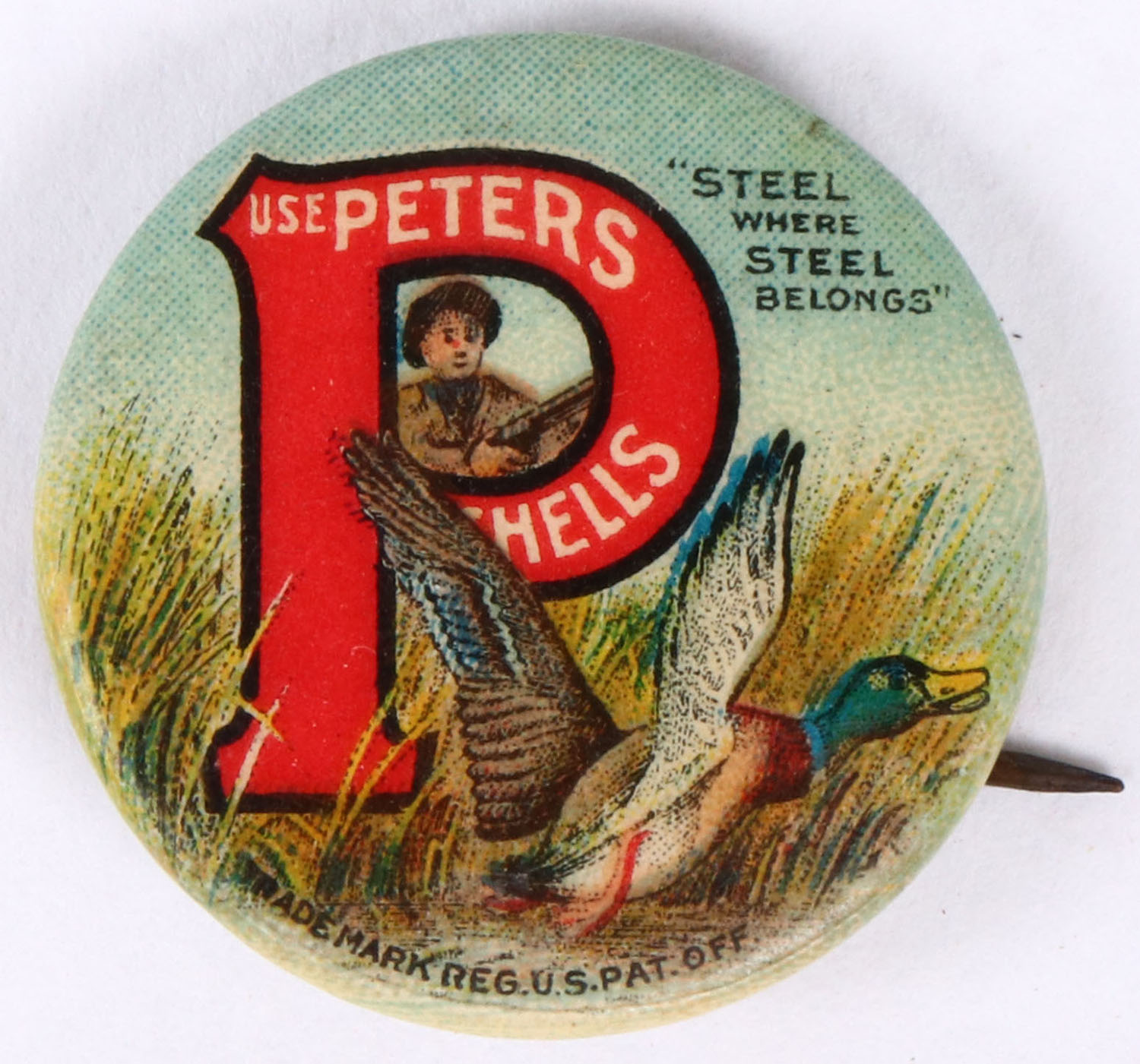 Peters Pinback, pictures a man duck hunting inside a large red P & mallard duck, 7/8'', Bastain Bros paperback, pin is solid & paperback shows minor age soiling . Grade: Excellent - Value: 20 to 100