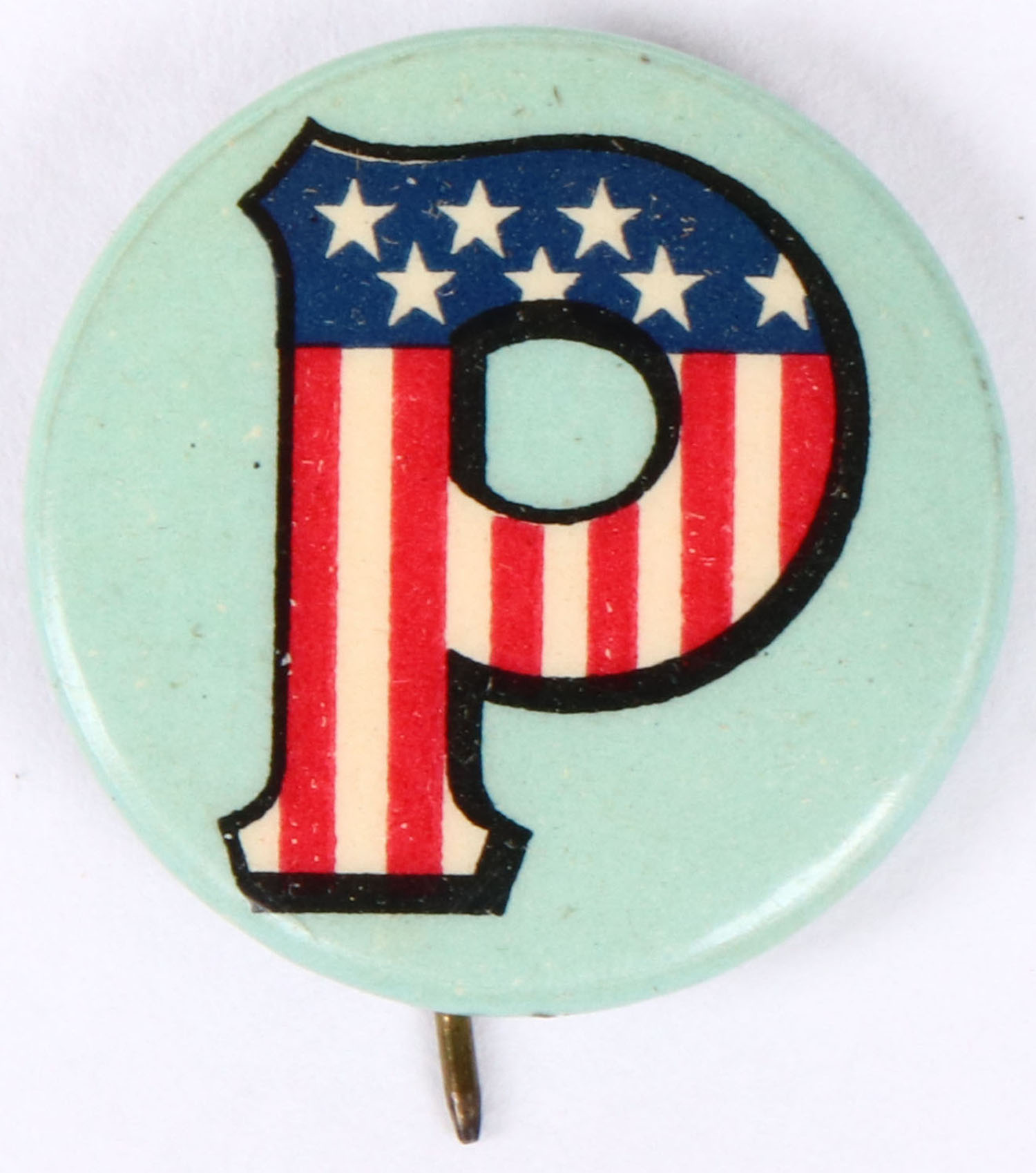 Peters pinback, image of large P with stars & stripes, 7/8'' diameter, pin & paperback are bright & clean. Grade: Excellent + - Value: 20 to 100