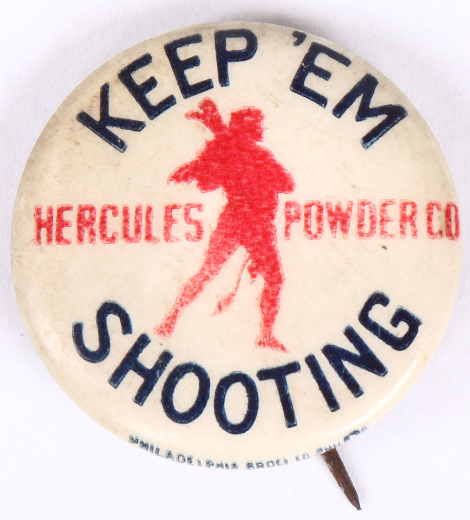 Hercules Powder Co. pinback, ''Keep 'Em Shooting'', pin has wear & minor discoloration, no paperback, back of pin has rust. Grade: Very Good - Value: 10 to 60