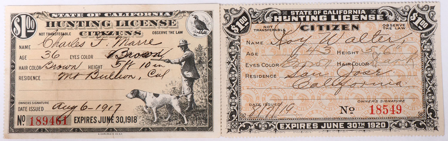 Lot of 2 EARLY California hunting Licenses, 1918 and 1920. Grade: Excellent - Value: 10 to 100