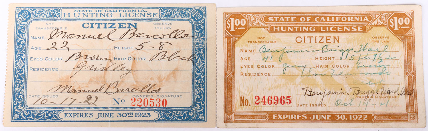 Lot of 2 EARLY California hunting Licenses, 1922 and 1923. Grade: Excellent - Value: 10 to 100