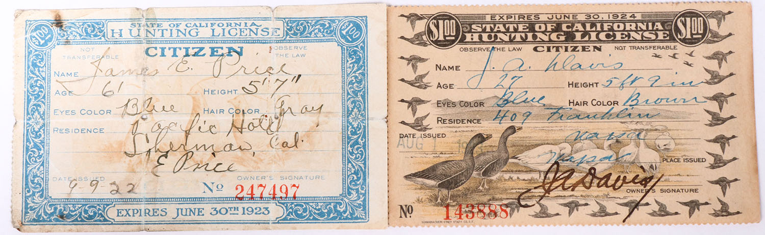 Lot of 2 EARLY California hunting Licenses, 1923 and 1924. Grade: Excellent - Value: 10 to 100