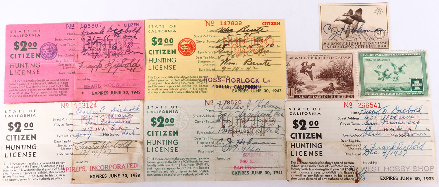 Lot of 5 California hunting Licenses and 3 stamps, 1938(2), 1941, 1942, 1943. Grade: Excellent - Value: 6 to 60