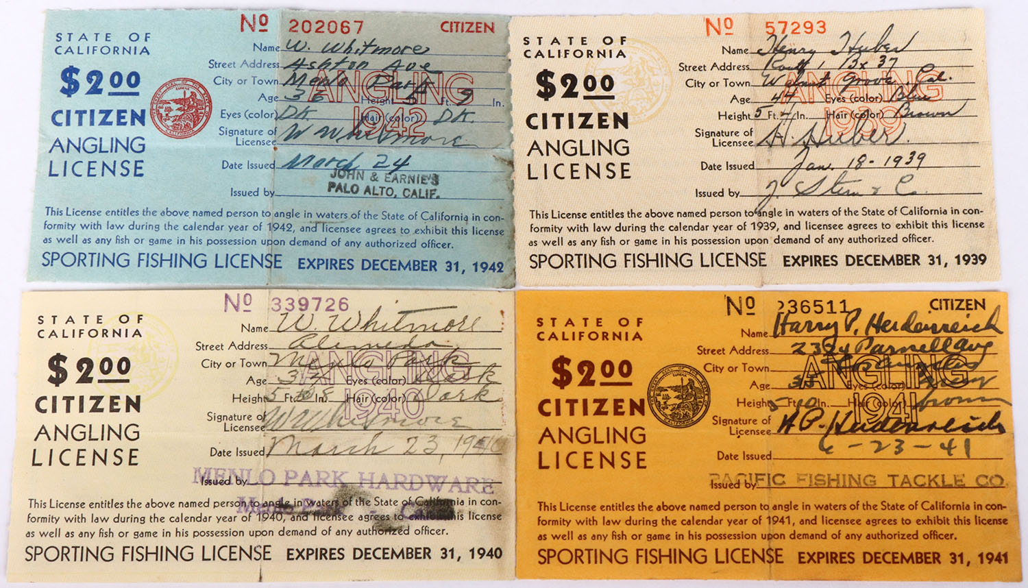 Lot of 4 California Fishing License, 1939, 1940, 1941 and 1942. Grade: Excellent - Value: 4 to 40