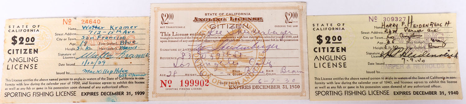 Lot of 3 California Fishing License, 1930, 1939 and 1940. Grade: Excellent - Value: 4 to 50