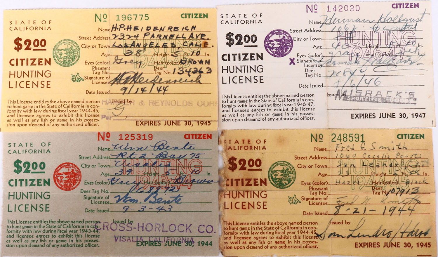 Lot of 4 California Hunting License, 1944, 1945(2) and 1947, one license shows wear. Grade: Very Good + - Value: 4 to 40