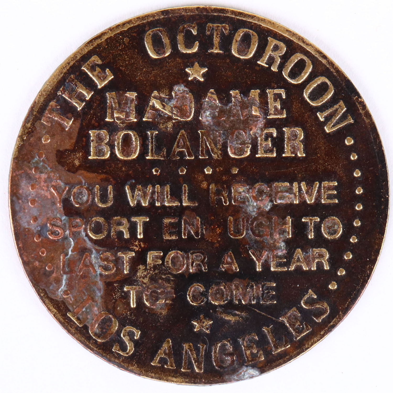 Double sided Brothel Token dated 1881, Los Angeles, 1 1/2'' diameter, shows wear. Grade: Very Good + - Value: 40 to 100