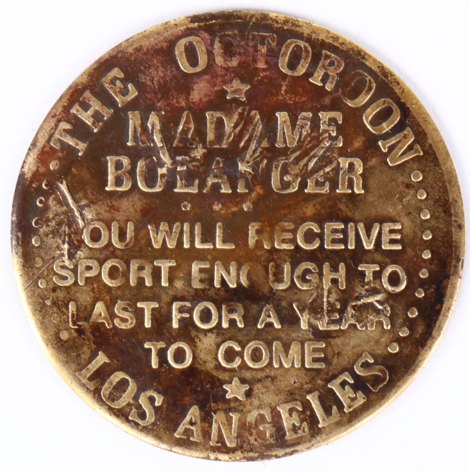 Double sided Brothel Token dated 1888, Los Angeles, 1 1/2'' diameter, shows wear. Grade: Very Good + - Value: 40 to 100