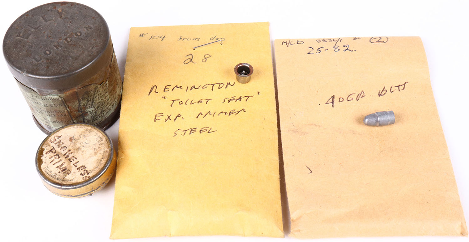 Eley Percussion caps - empty, unknown primers, (5) 40 gr bullets, (6) Remington ''toilet seat'' primers. Grade: Good + - Value: 10 to 100