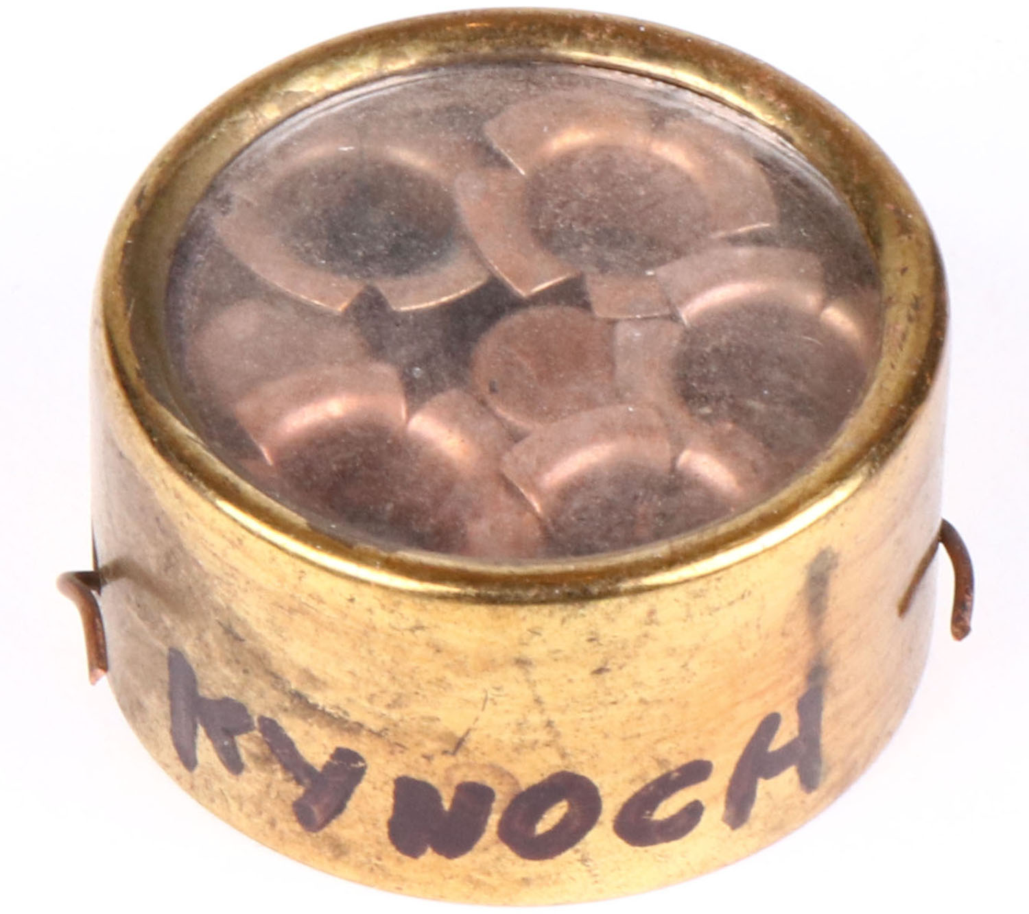 Percussion caps, 7 total, Kynoch written in Sharpie on side of case. Grade: Very Good + - Value: 4 to 60