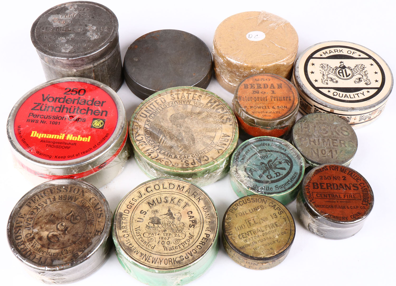 Very large lot of Early tins, percussion caps or primers, all partial. Grade: Very Good - Value: 50 to 300