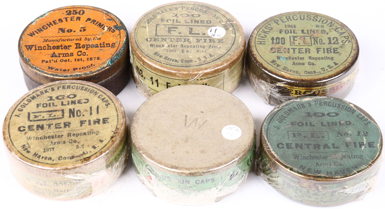Lot of 6 Winchester Percussion caps and Primers, 4 empty and 2 partial. Grade: Very Good - Value: 4 to 40