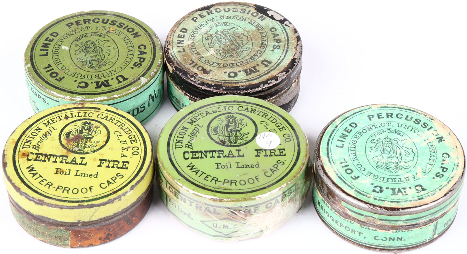 Lot of 5 UMC doghead logo primer tins, all Partial, some scuffing, still solid. Grade: Very Good - Value: 10 to 100