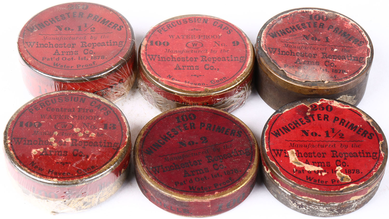 Lot of 6 Winchester primers and Percussion caps, all partial. Grade: Very Good ++ - Value: 10 to 60