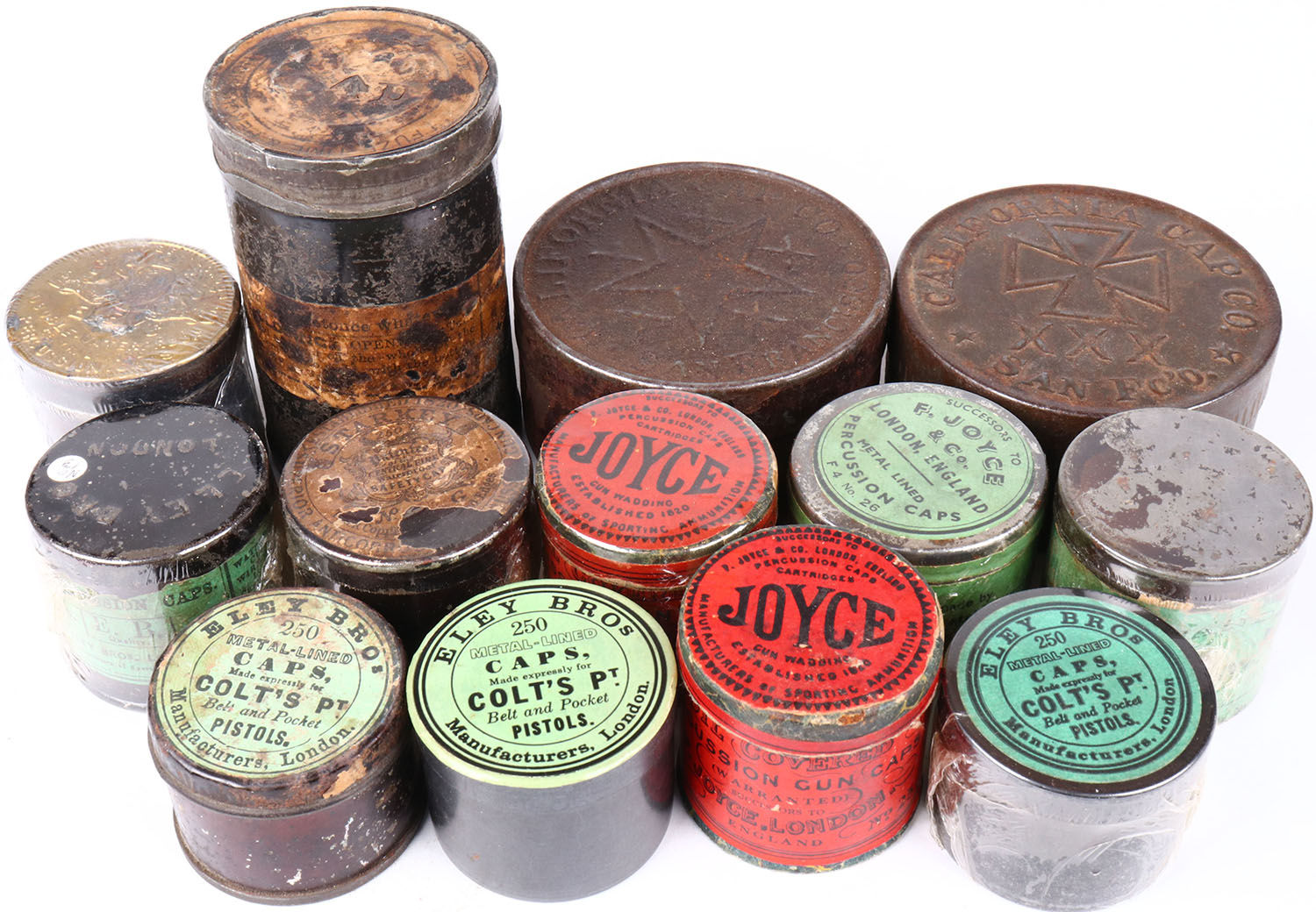 Large lot of percussion cap tins, all empty. Grade: Very Good - Value: 20 to 400