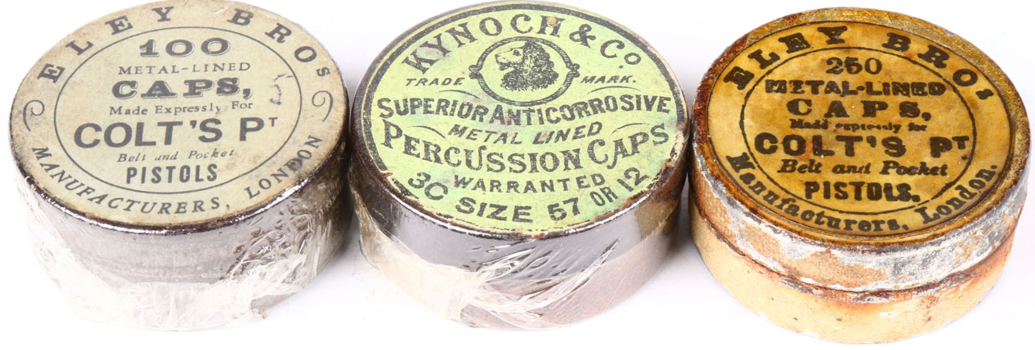 Lot of 3 percussion cap tins, all appear full, 2 Eley & 1 Kynoch. Grade: Very Good + - Value: 10 to 60