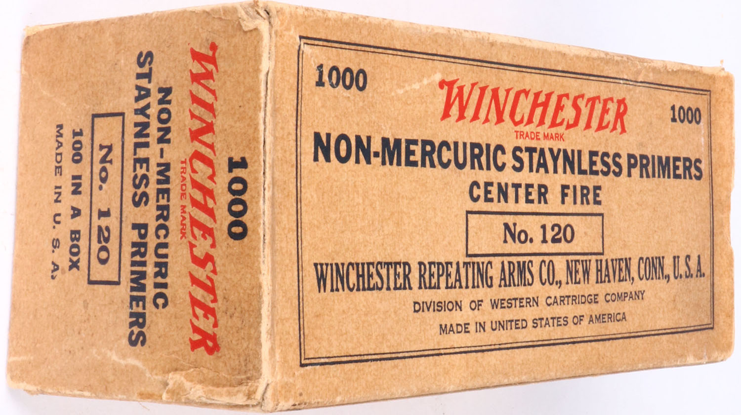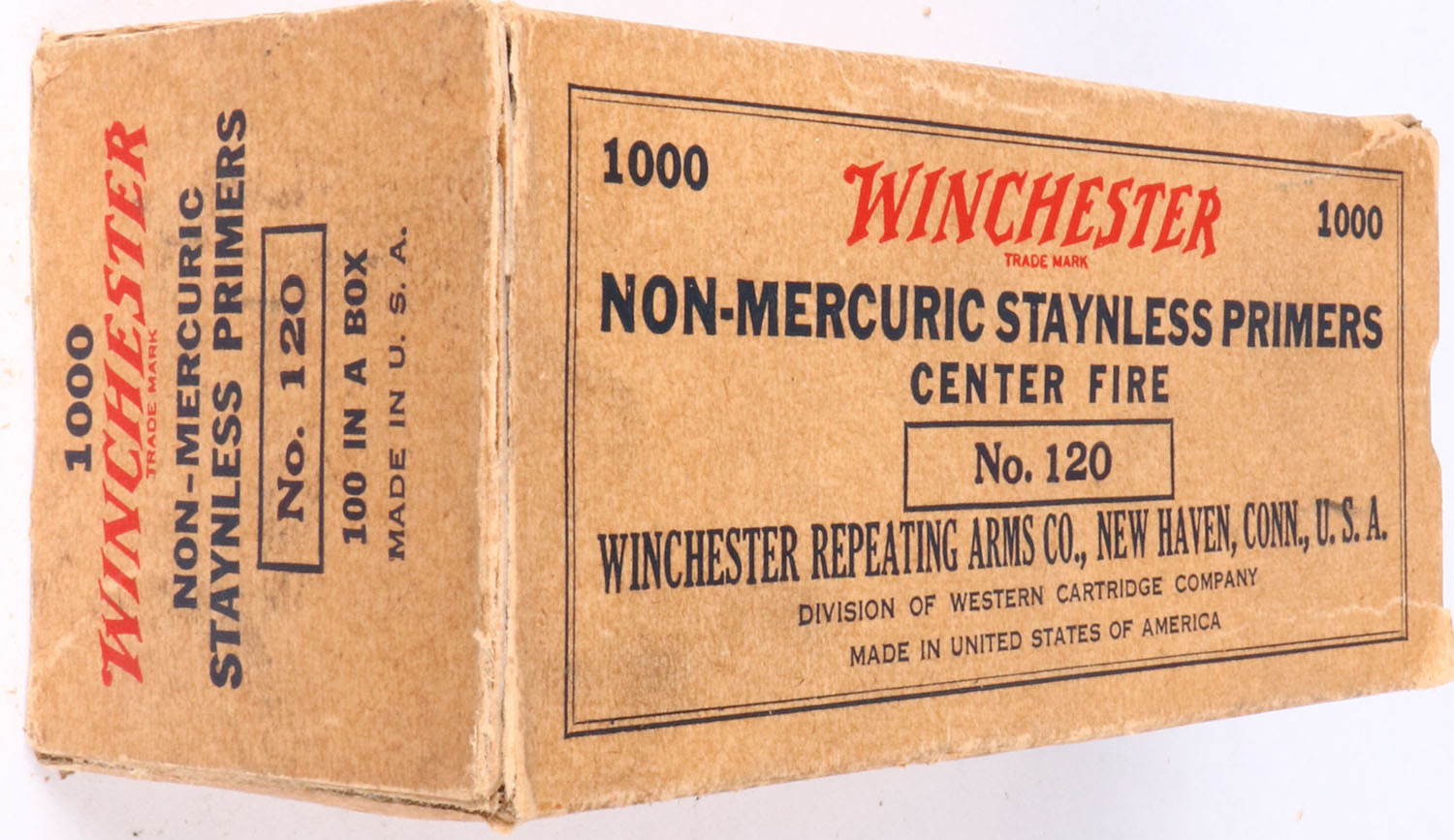 Winchester primer brick, FULL, No 120 primers, inside primer boxes all bright and clean, brick has weak end flaps. Grade: Excellent - Value: 30 to 90