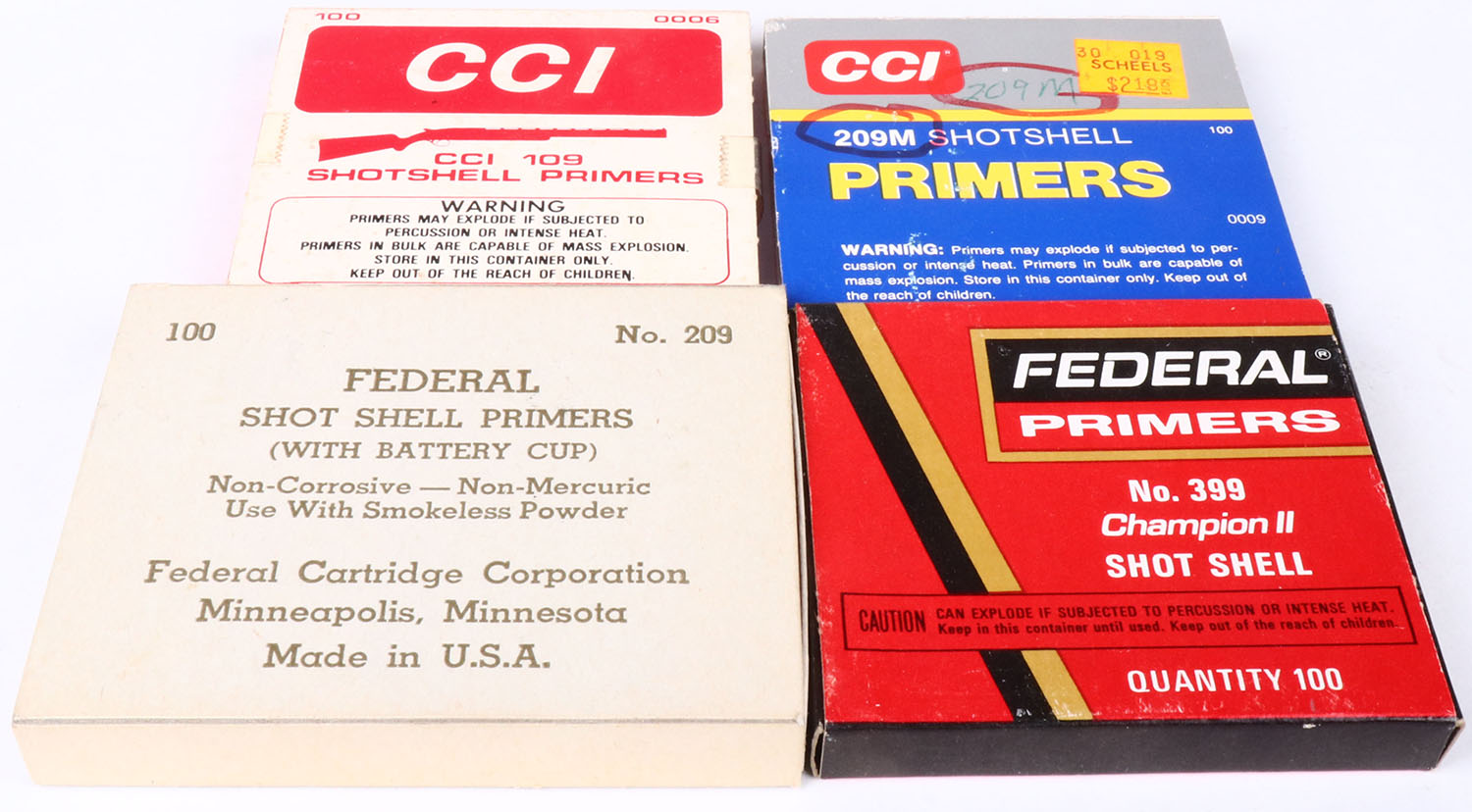 Lot of 4 shot shell primer boxes, 2 Federal and 2 CCI, 2 Partial and 2 full. Grade: Very Good - Value: 4 to 40