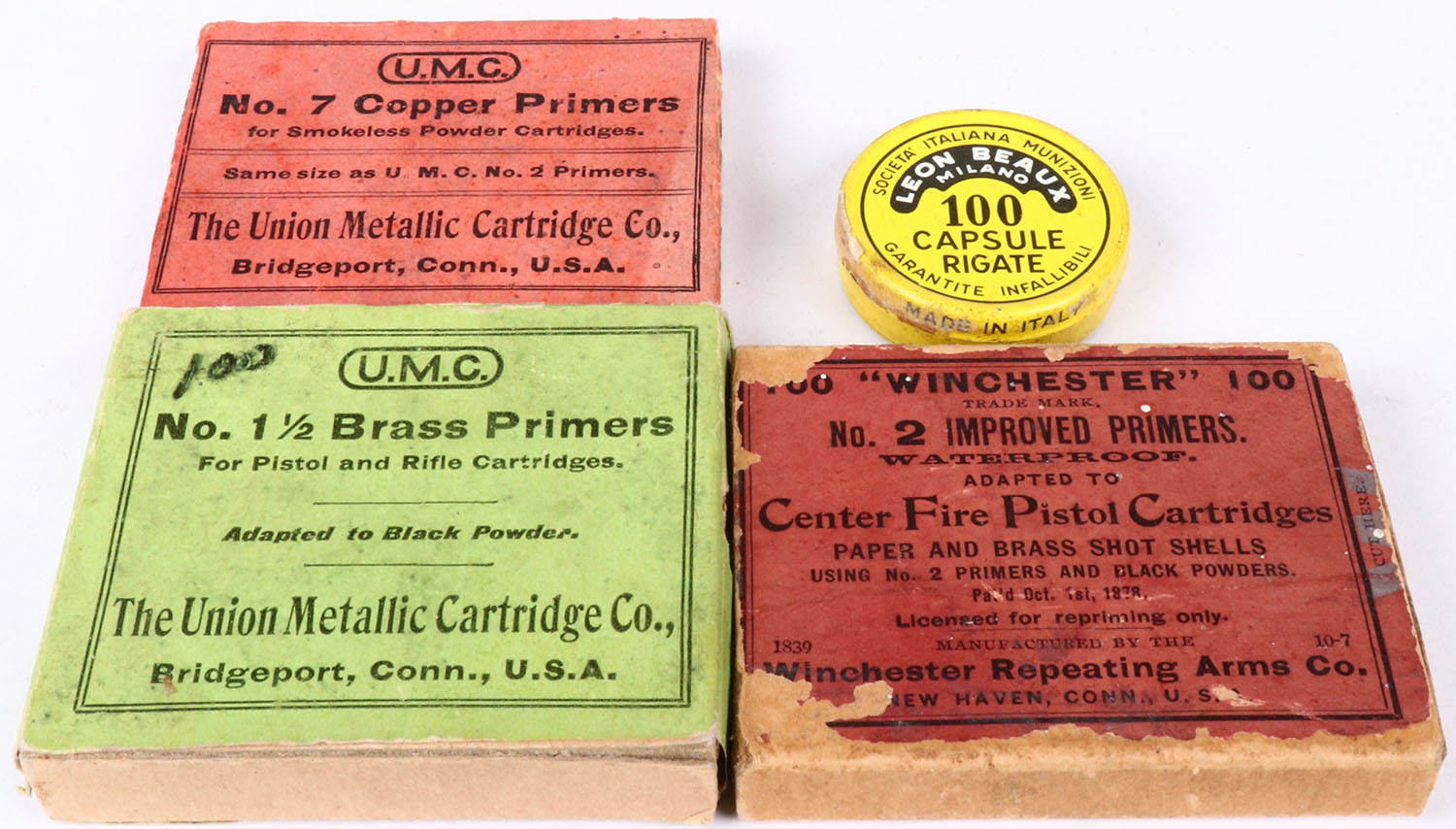 Lot of 4 primer boxes/tin, all partial, all have age soiling. Grade: Very Good - Value: 4 to 60