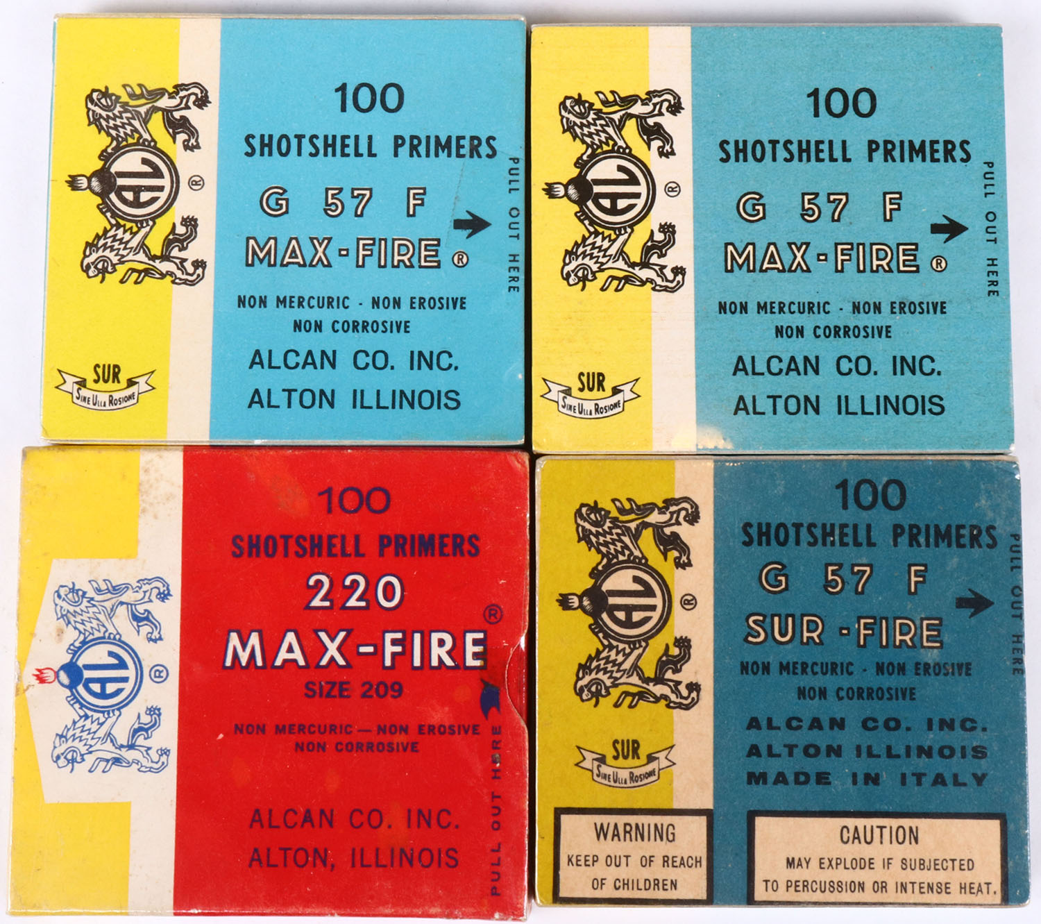Lot of 4 Alcan primer boxes, 4 Full, all solid. Grade: Excellent - Value: 6 to 60