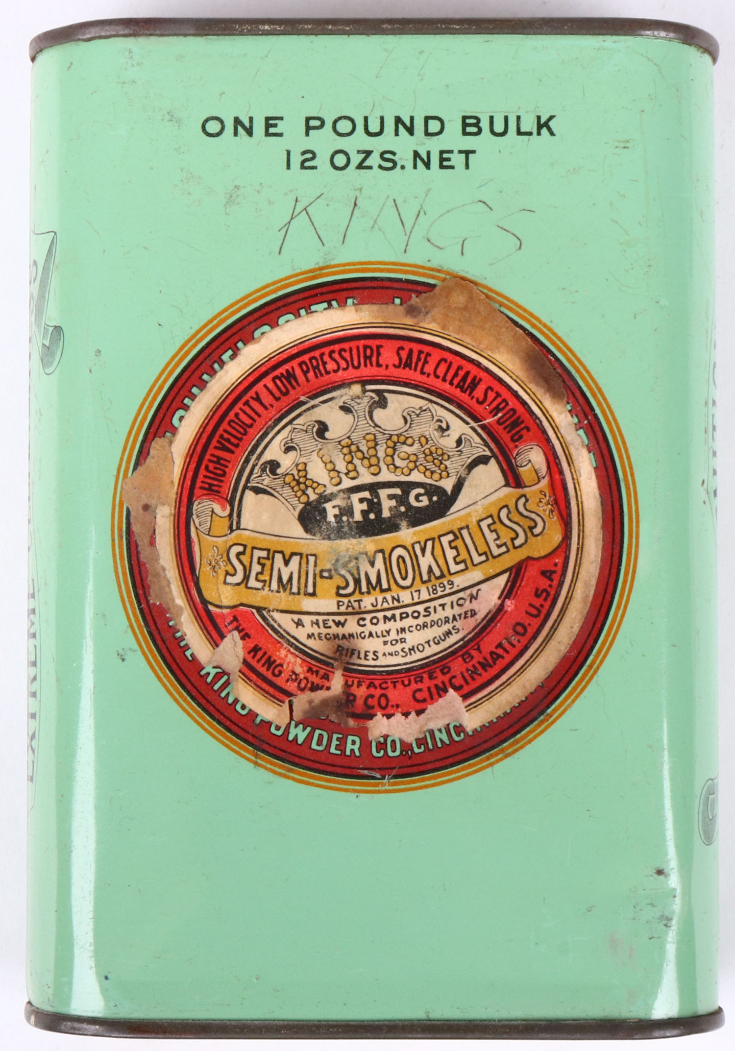 The King Powder Gunpowder tin, empty, has age soiling. Grade: Very Good ++ - Value: 20 to 80