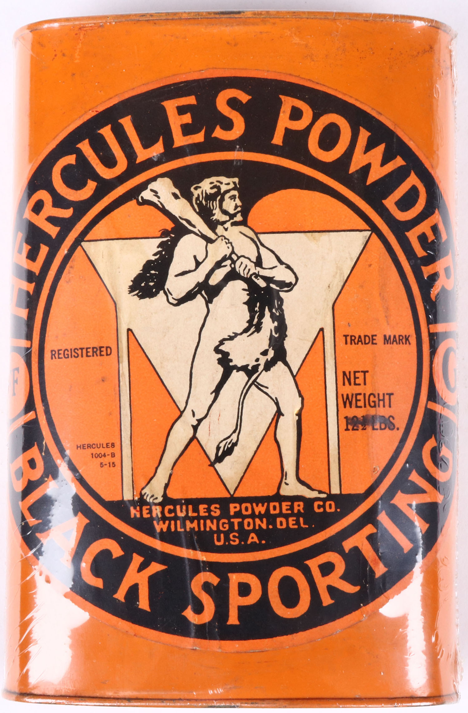 The Hercules powder tin, black sporting, empty, has age soiling. Grade: Excellent - Value: 16 to 60