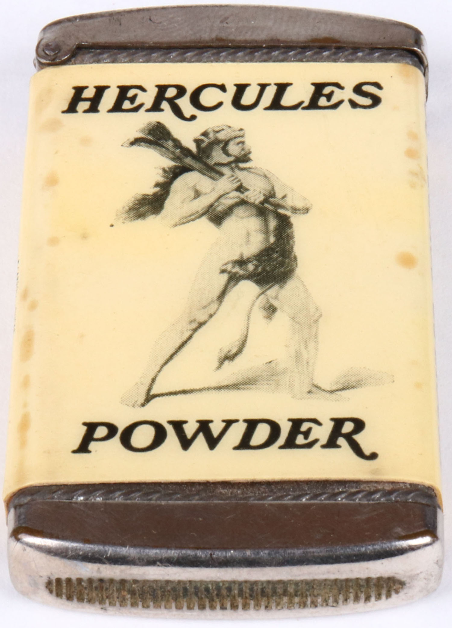 Hercules powder metal container, maybe for matches, well made, has some age soiling. Grade: Excellent - Value: 2 to 40
