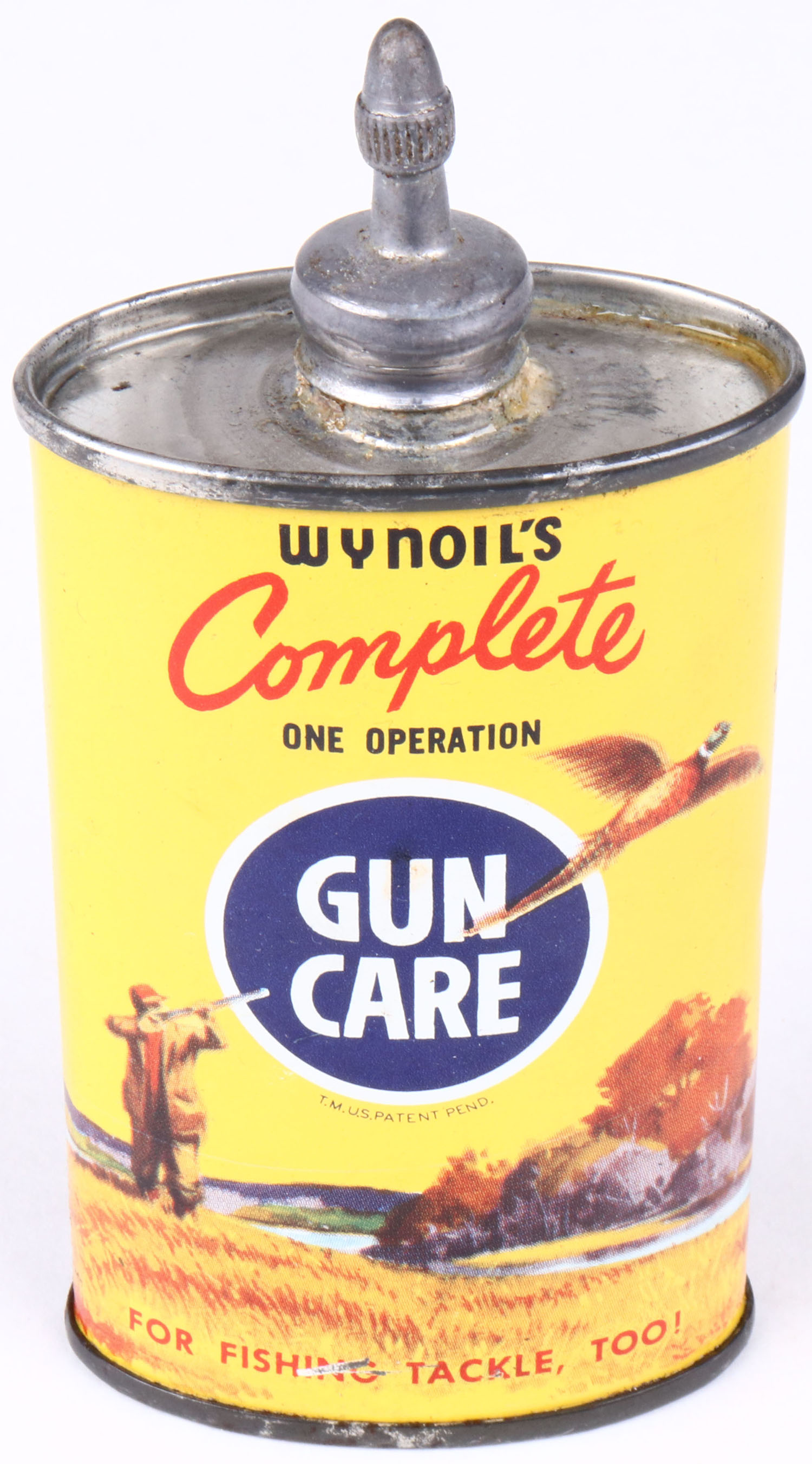RARE! Complete Gun Care oil tin, Empty, great color with some age soiling, tin spout and tin cap. Grade: Very Good ++ - Value: 200 to 600