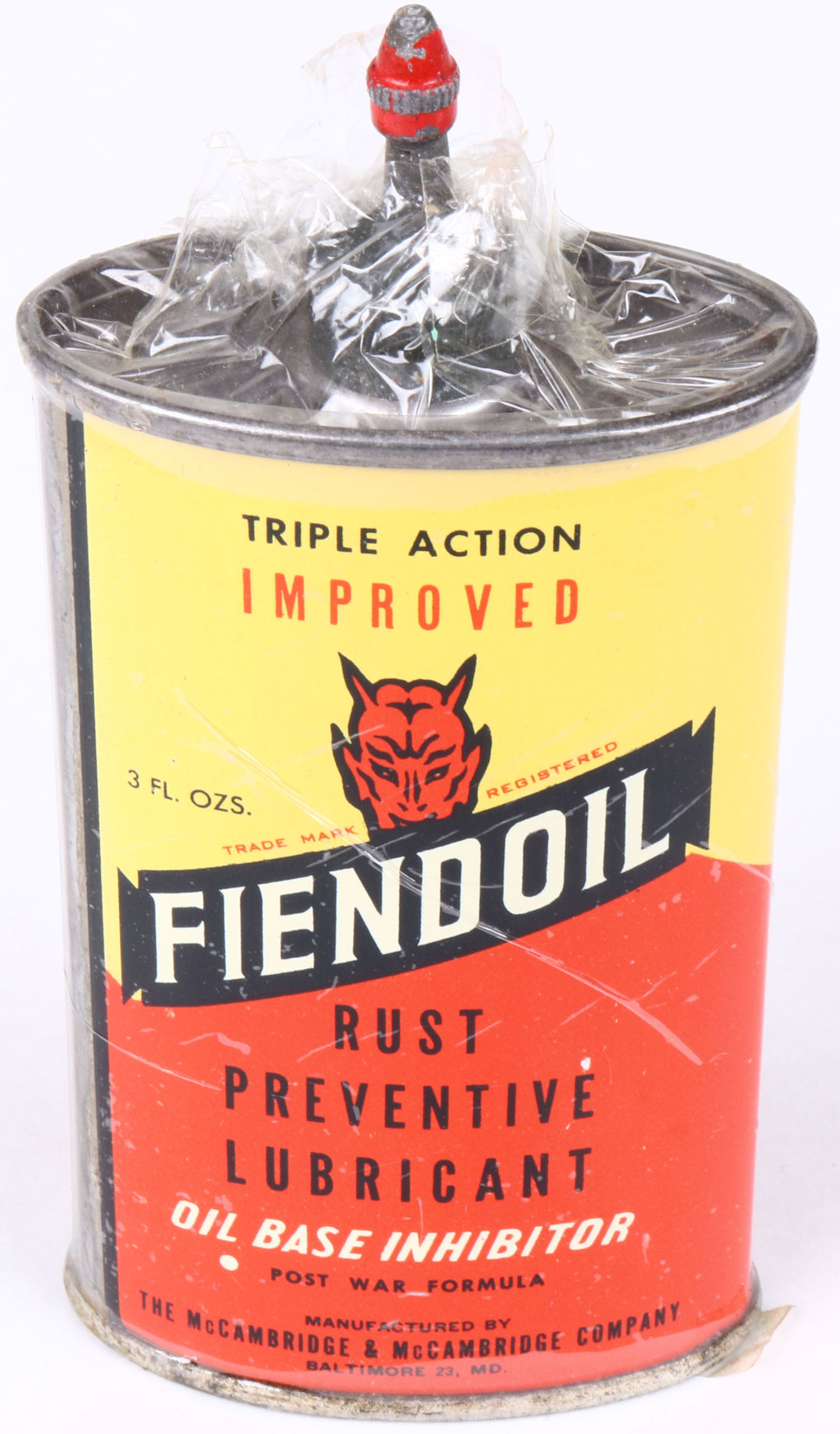 RARE! Fiendoil Oil Tin, lead spout & cap, partial maybe 50%, all bright and clean. Grade: Excellent + - Value: 10 to 50