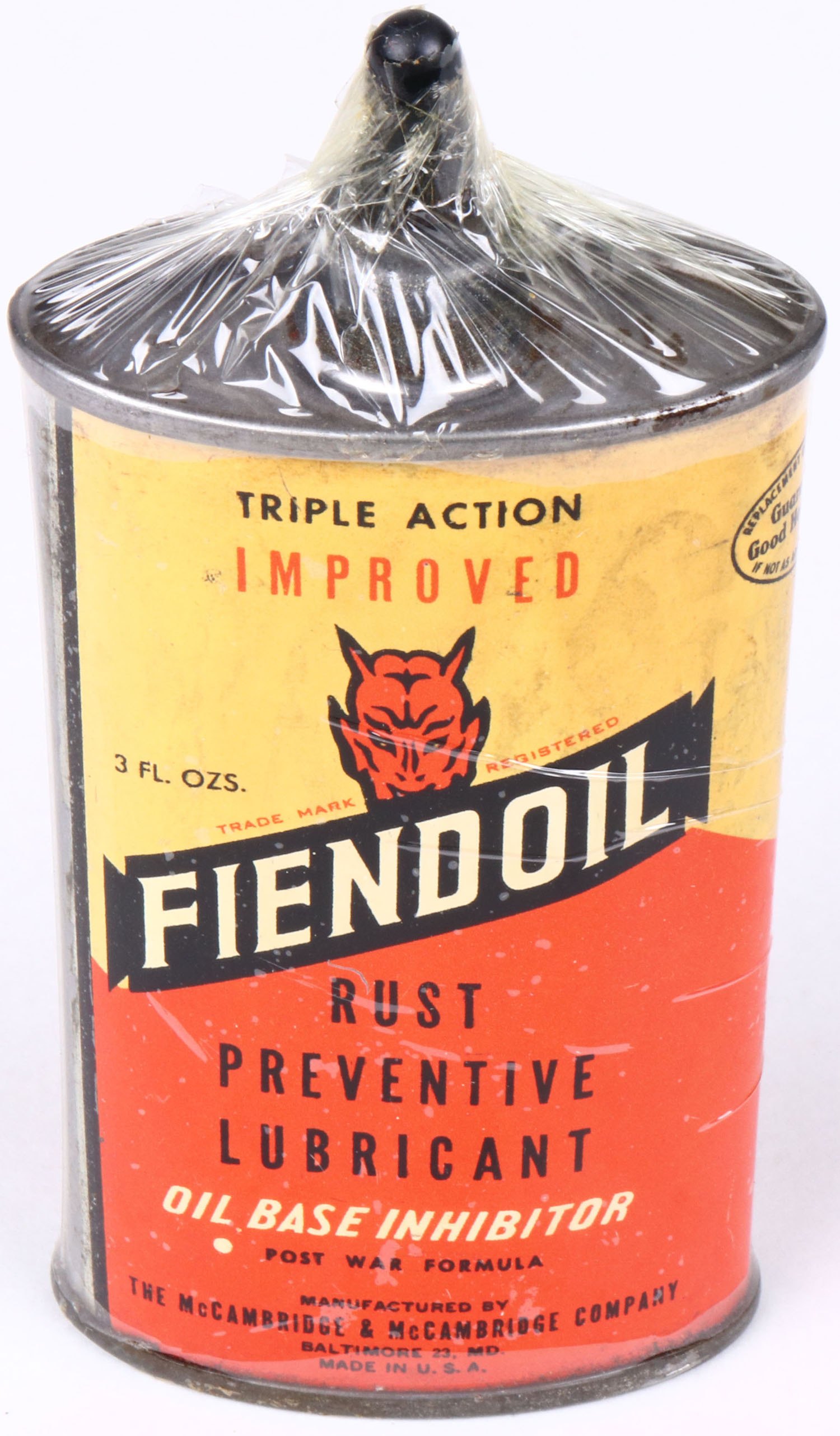 Fiendoil Oil Tin, lead spout & plastic cap, Empty, solid with some age soiling. Grade: Excellent - Value: 16 to 60