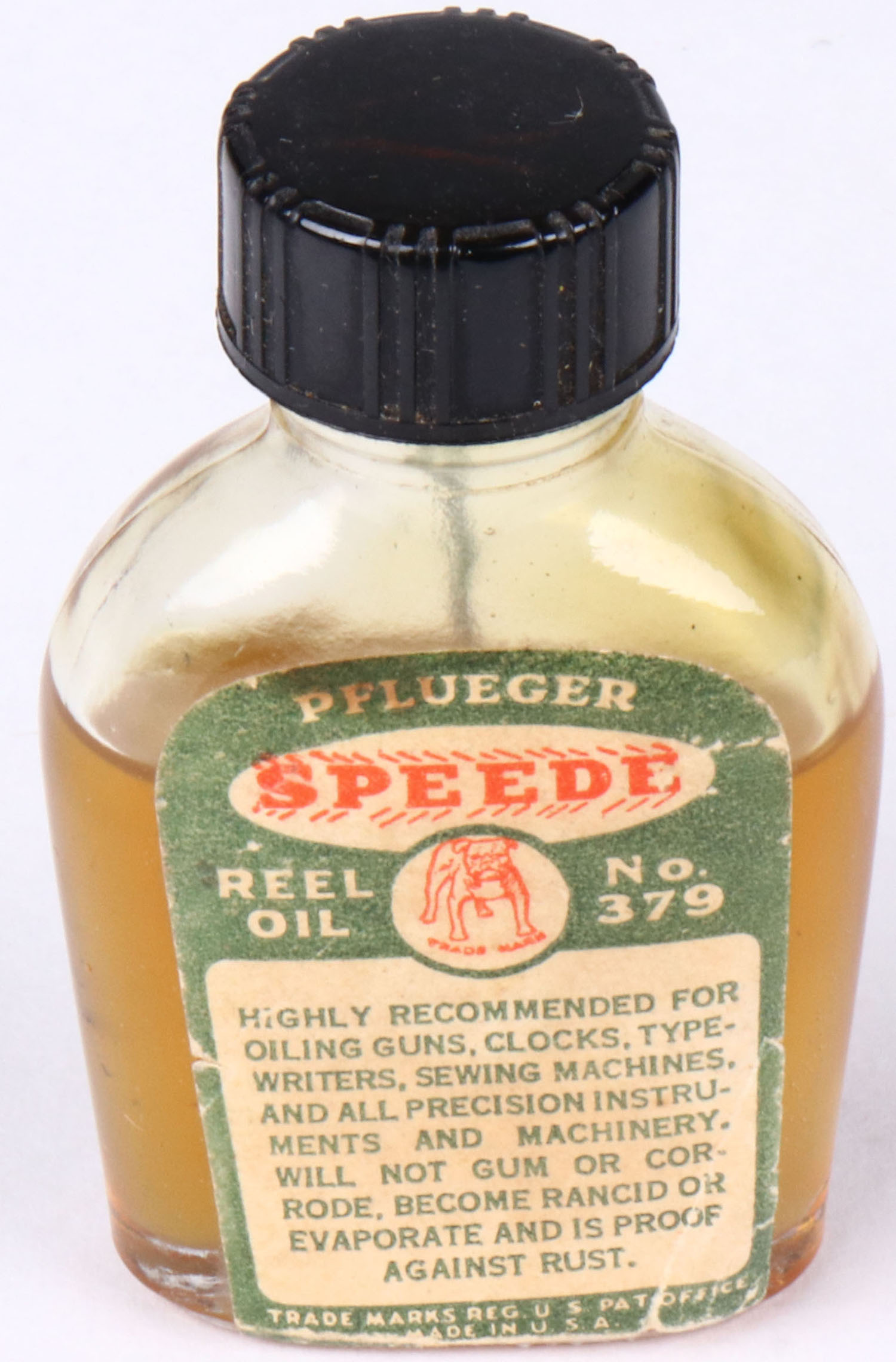 Pflueger Reel oil glass jar, has age soiling. Grade: Very Good - Value: 6 to 60