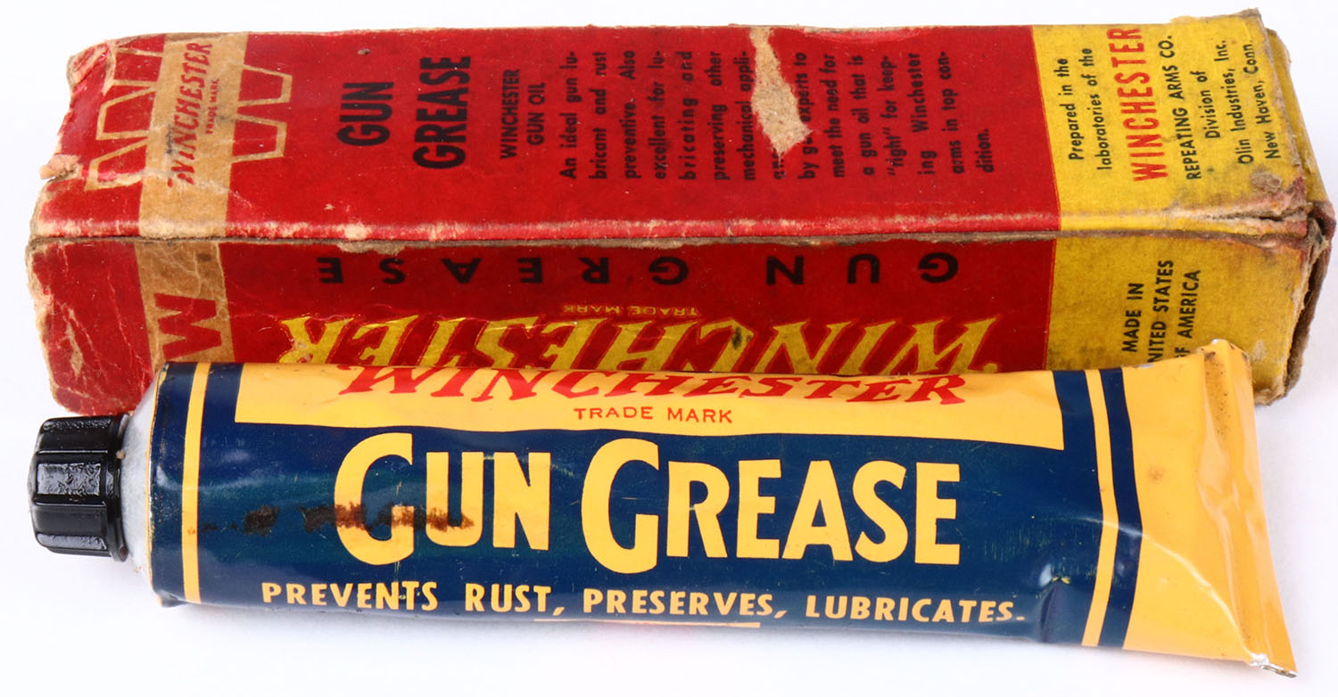 Winchester Gun Grease tube, in original box, tube is solid and box has some scuffing. Grade: Very Good - Value: 4 to 60