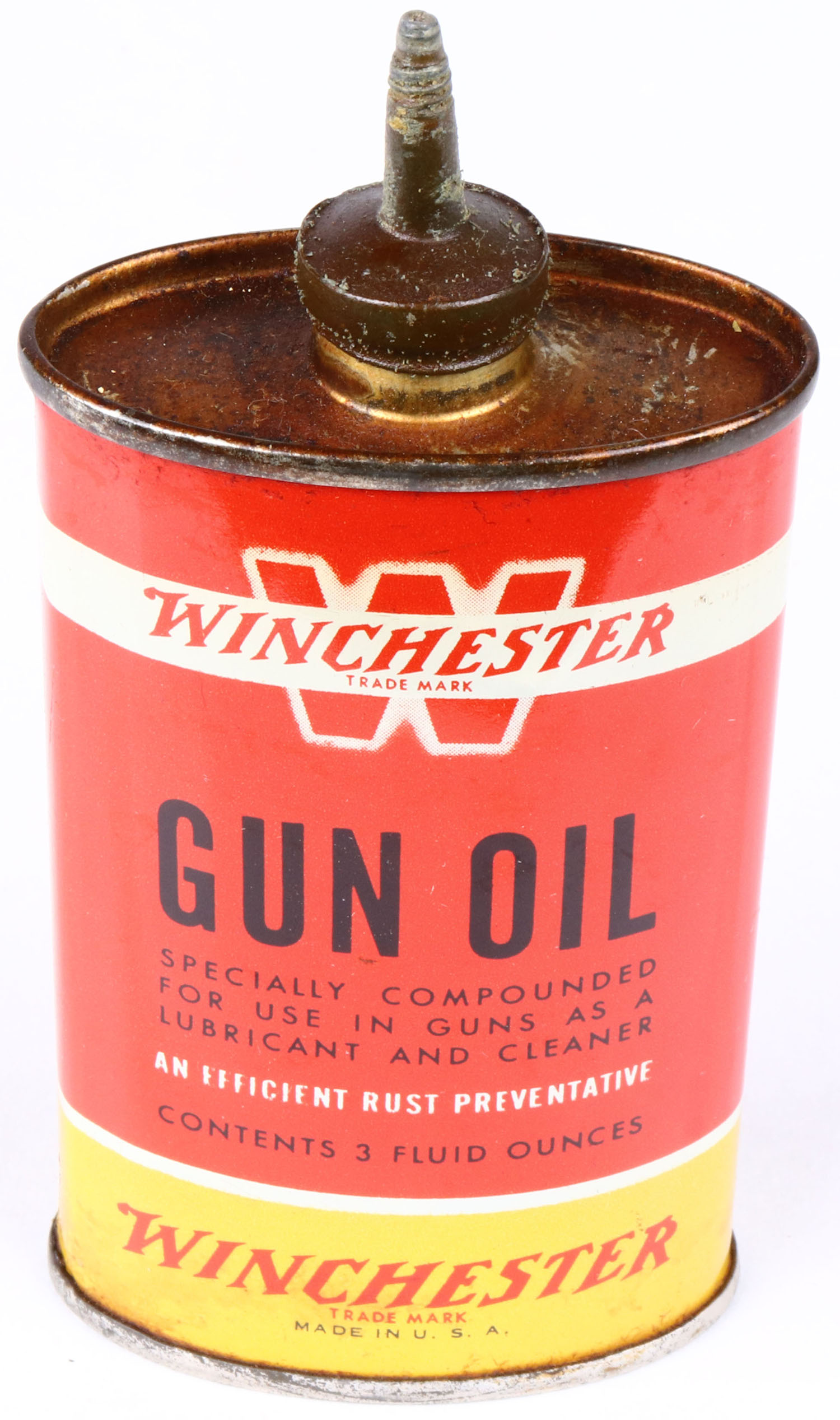 Winchester Oil Tin, Gun Oil, empty, lead spout, some age soiling. Grade: Very Good - Value: 10 to 50