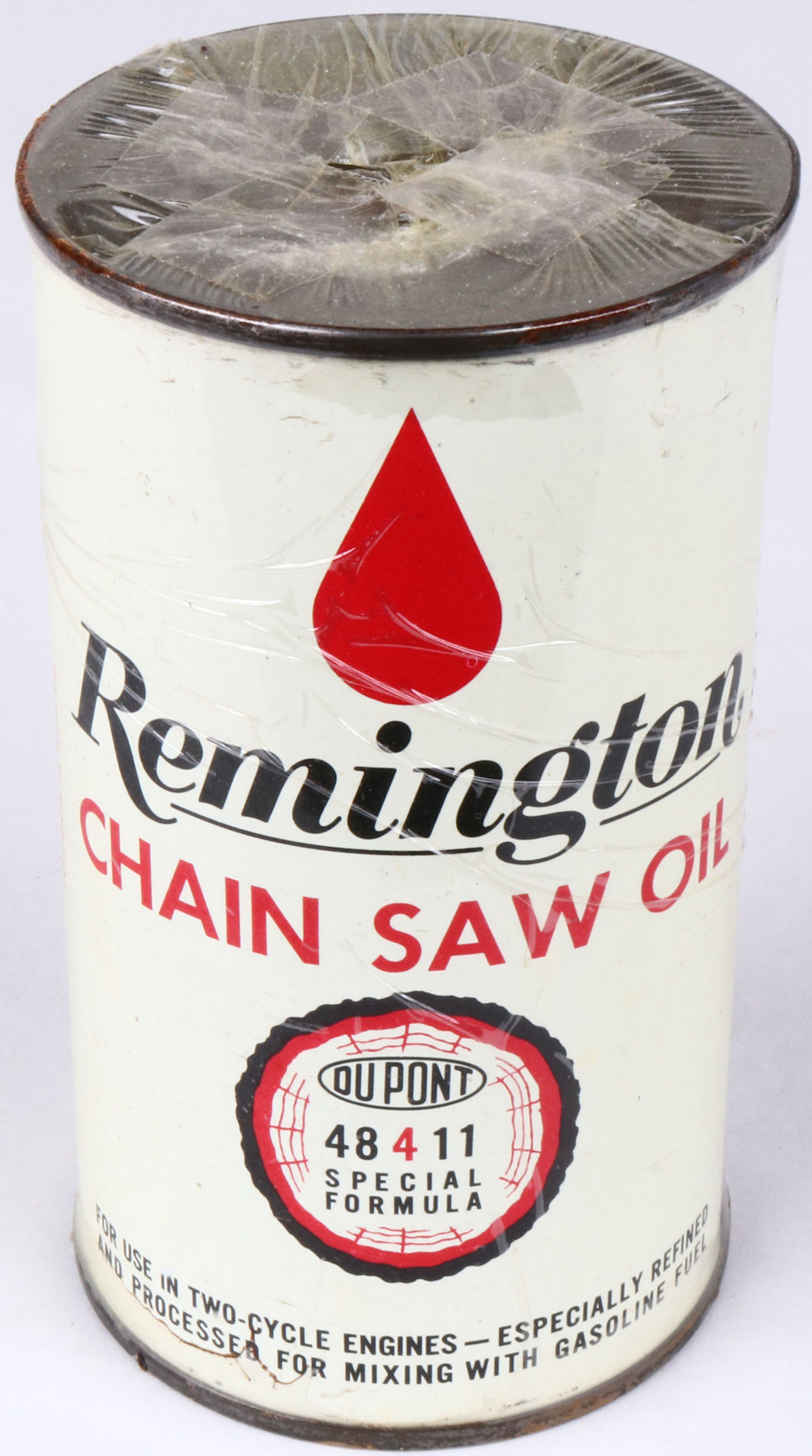 Large Remington Chainsaw oil tin, appears FULL, solid with some age soiling. Grade: Excellent - Value: 10 to 100