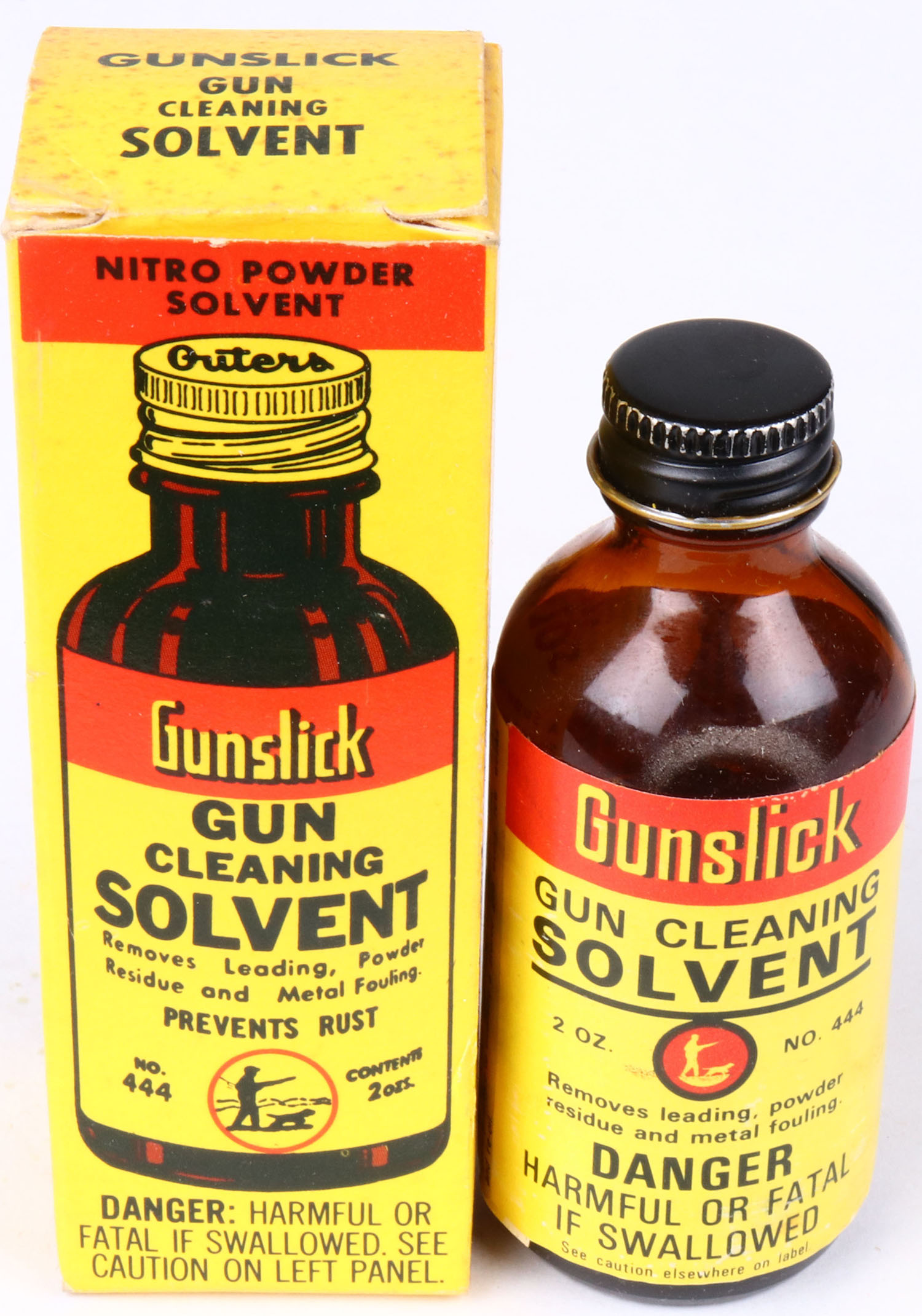 Gunslick gun cleaning solvent, in original box, Partial bottle, box is solid with very light age soiling. Grade: Excellent - Value: 4 to 40