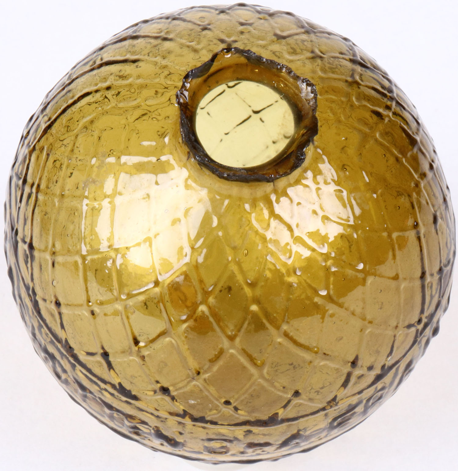 RARE! Yellowish amber Glass Target Ball, square pattern, ''Dr. A. Frank Charlottenburg Glashutten'', 2 5/8'' dia., low neck, circa 1880-1900. Grade: Excellent ++ - Value: 300 to 600