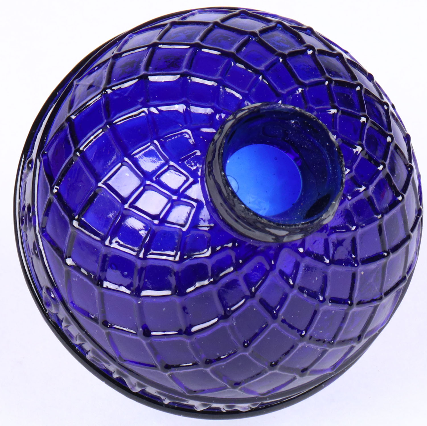 RARE! Deep blue Glass Target Ball, diamond pattern, ''Van Custem A St. Quentin'', 2 3/4'' dia., extremely high neck, circa 1880-1900. Grade: Excellent ++ - Value: 300 to 600